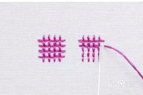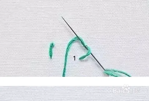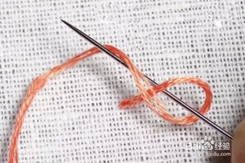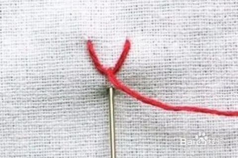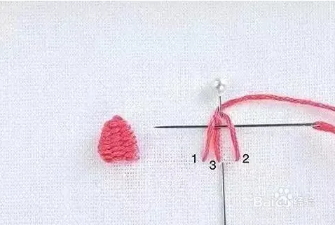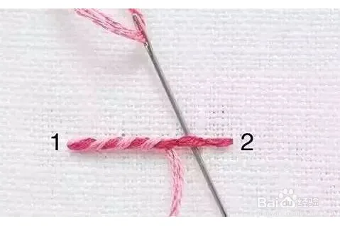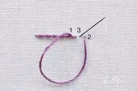 回针绣从绣布背面的1点位入针,绣布正面出针后在2点位入针至绣布背面,再从3点位入针至绣布正面出针,最后回到1点位,在正面入针,背面出针。
